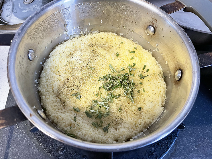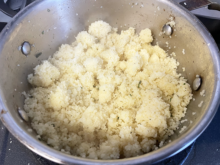 1. Cook Couscous: Bring the water to a boil, then add the couscous and mix. Cover the pan and remove from the heat. Leave covered for 5 minutes.